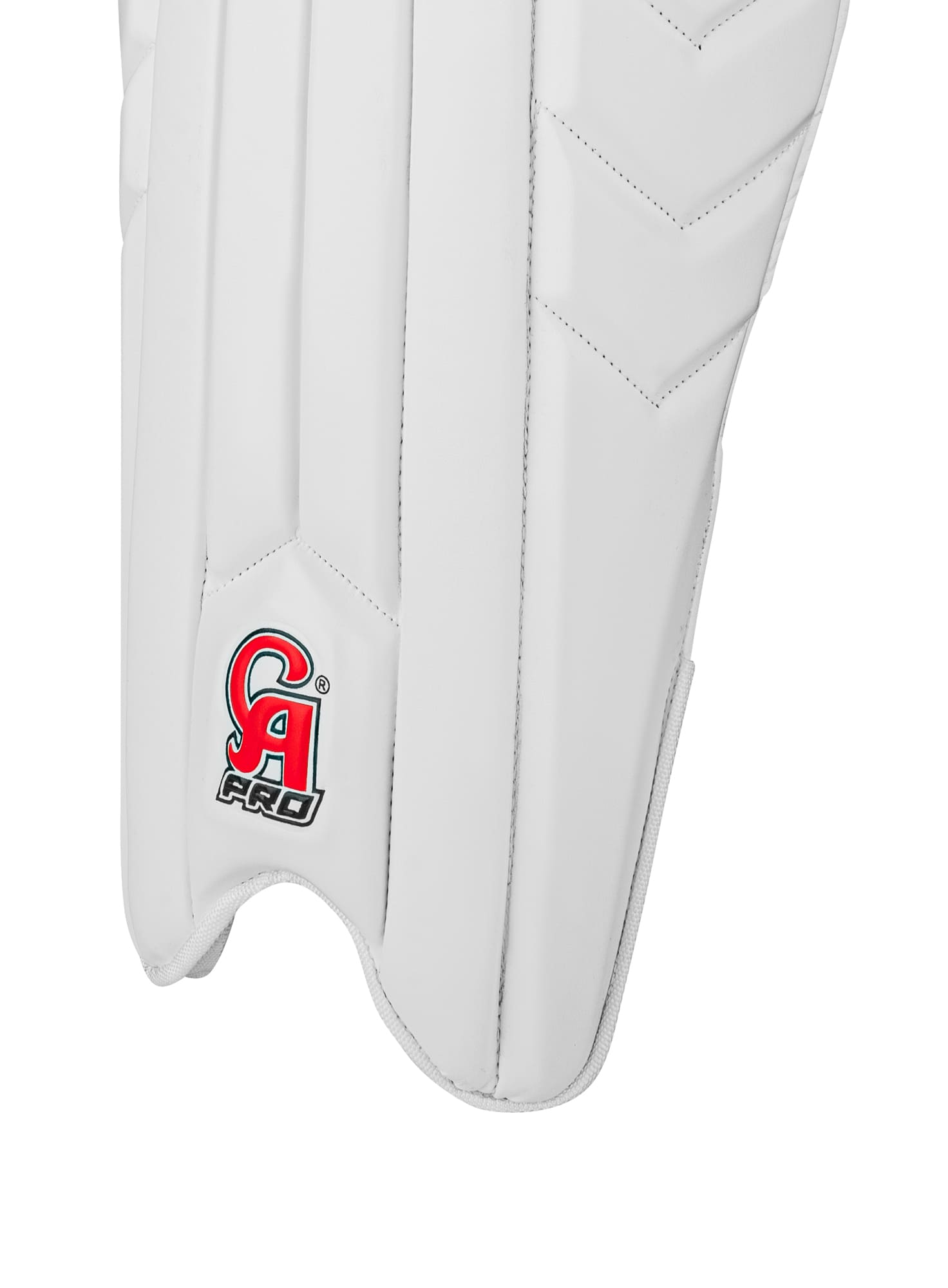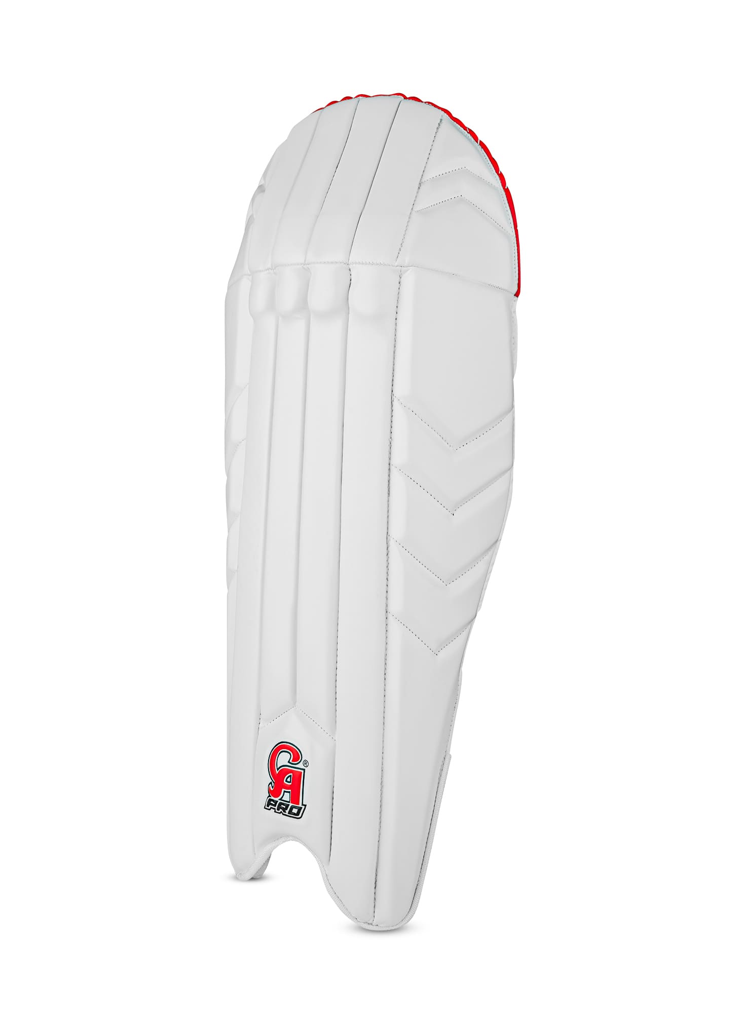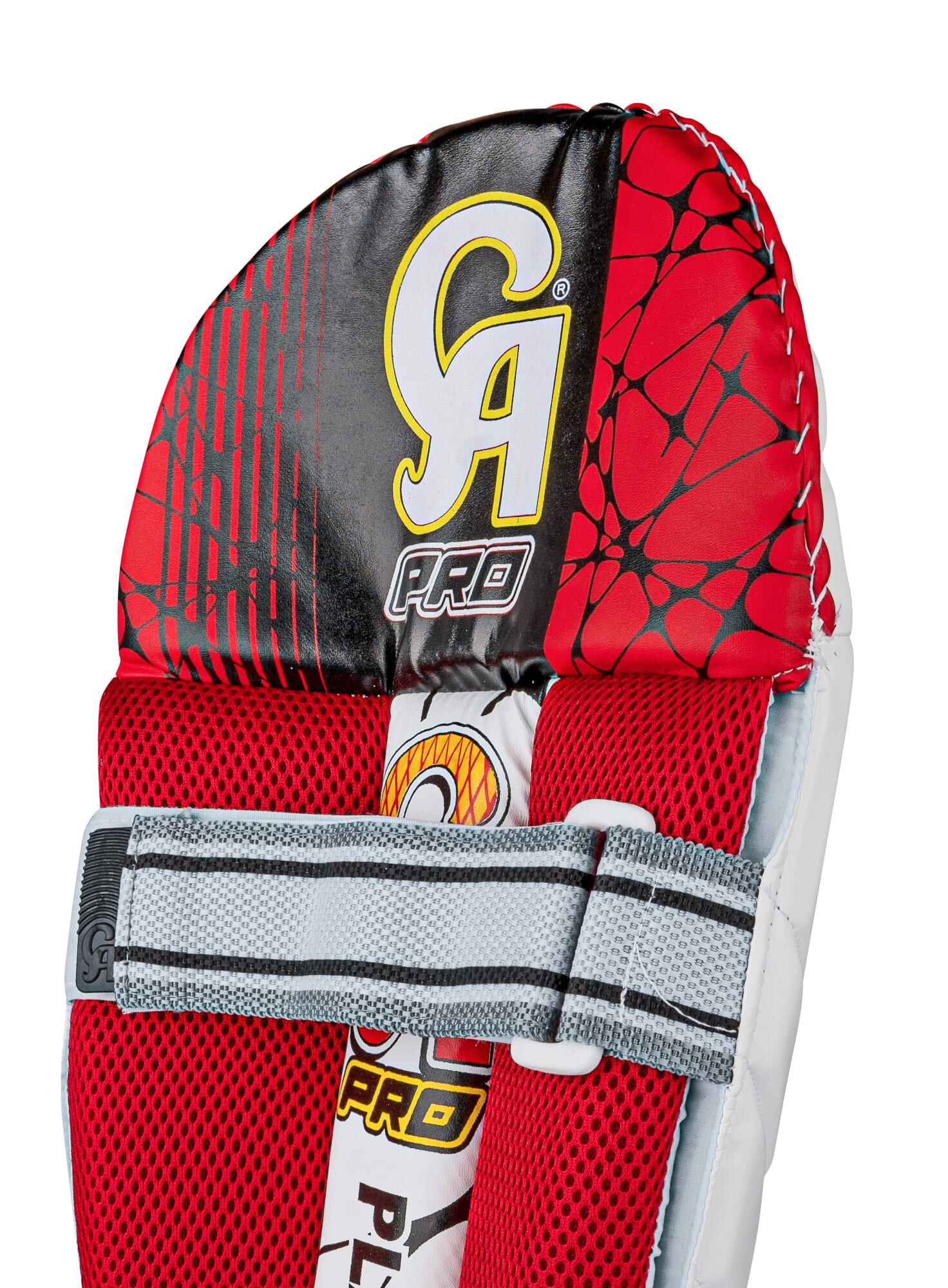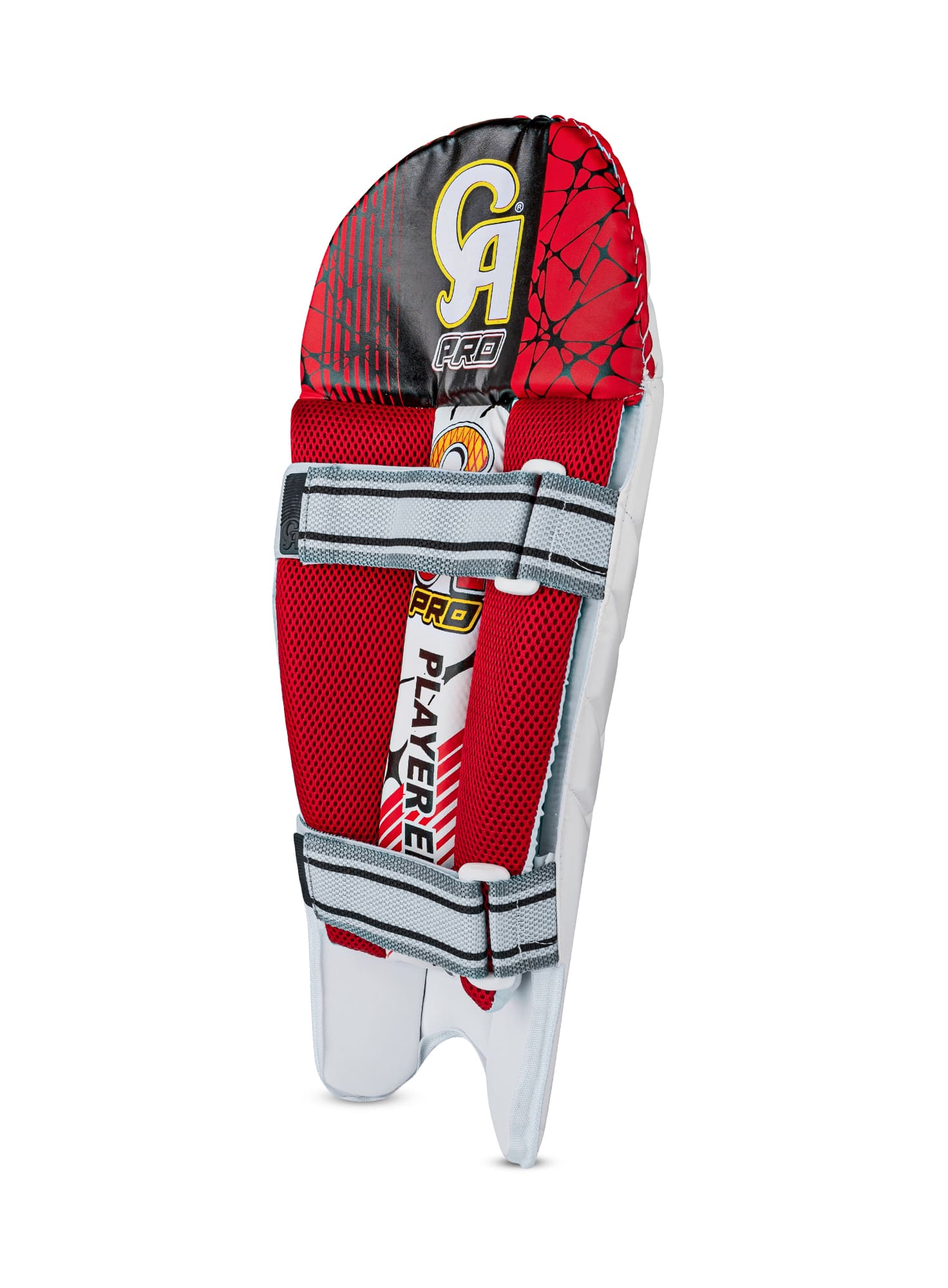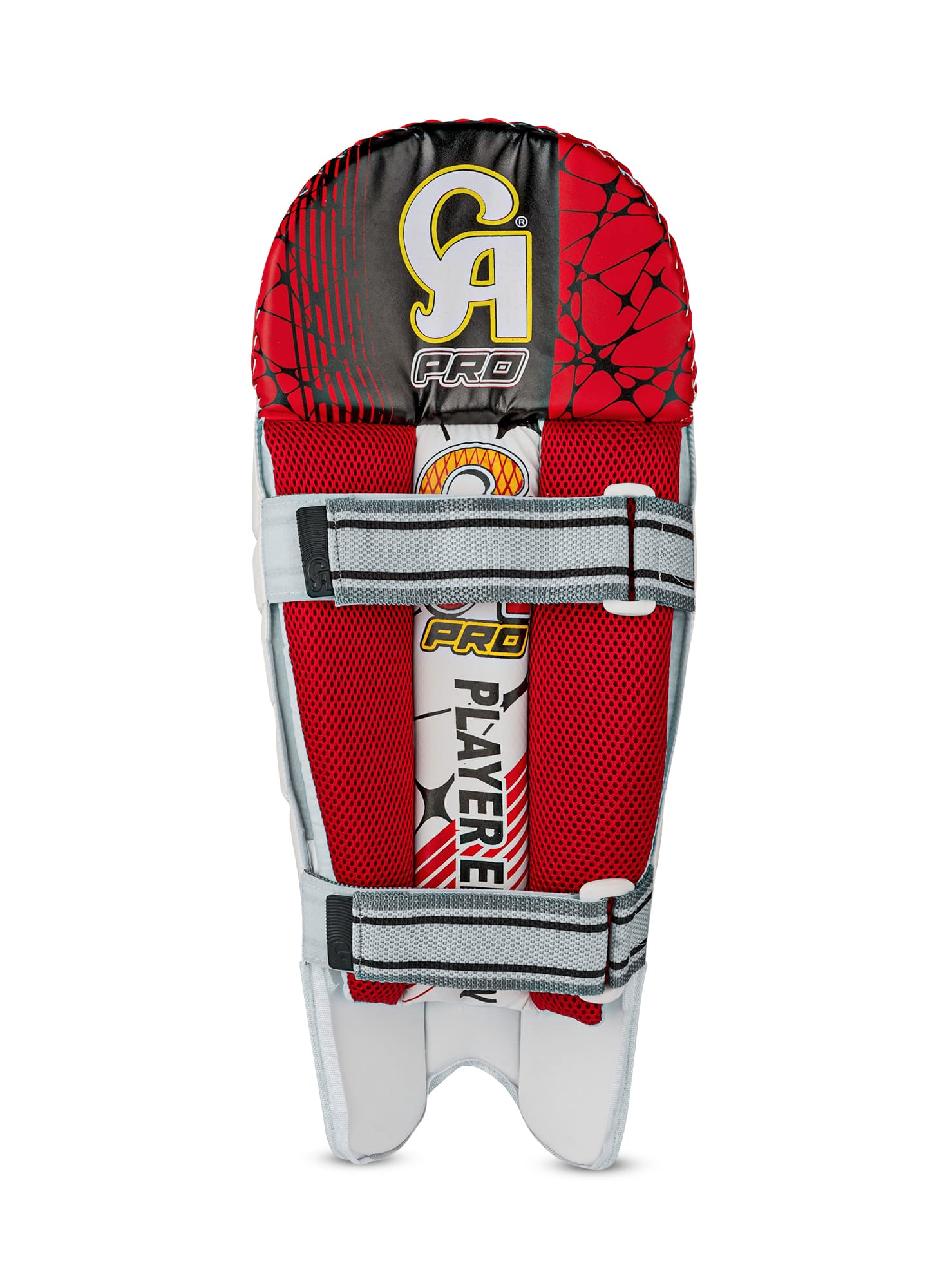 The CA Pro Player's Edition Wicket Keeping Pads are made for top-level keepers who need to move fast. These pads are very light, so you can jump, dive, and run without any extra weight holding you back. The outside of the pad has a clean white look with the classic CA Pro logo at the bottom. Inside, the pads use a thick, red mesh lining that is soft and lets air flow through to keep you cool during long matches. The inner section also has bold red, black, and yellow graphics, showing off the high quality "Player's Edition" style. These pads stay perfectly in place thanks to two wide, gray Velcro straps. The straps are strong and easy to adjust for a safe fit. Whether you are standing up to the stumps or back to the fast bowlers, these pads give you the protection and comfort of a professional player.