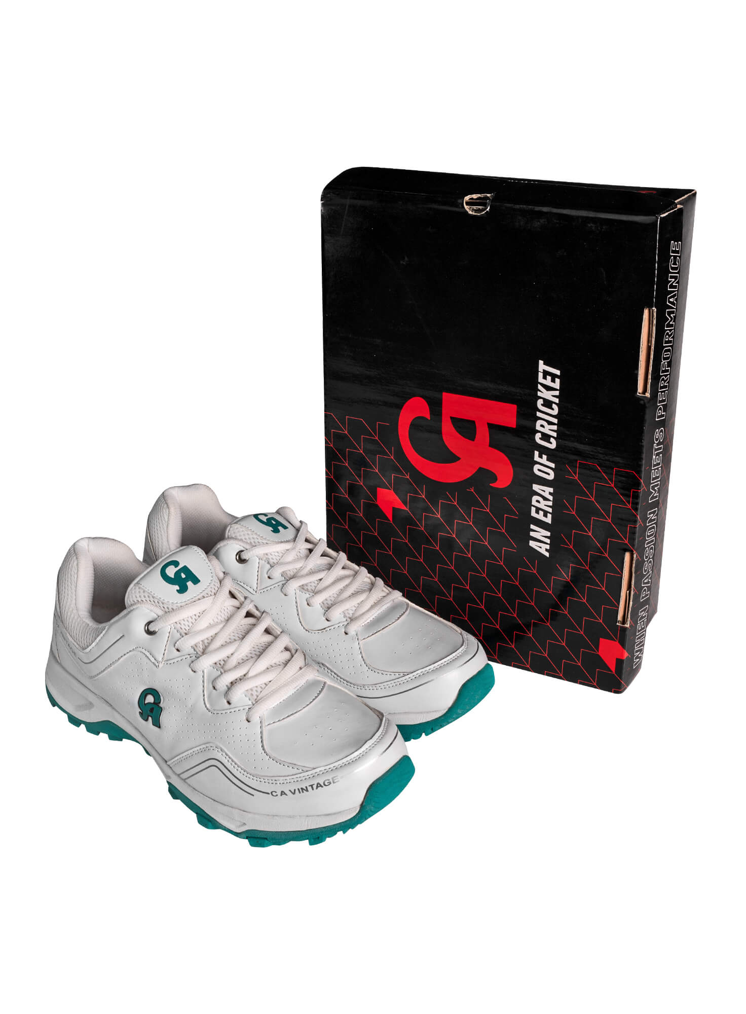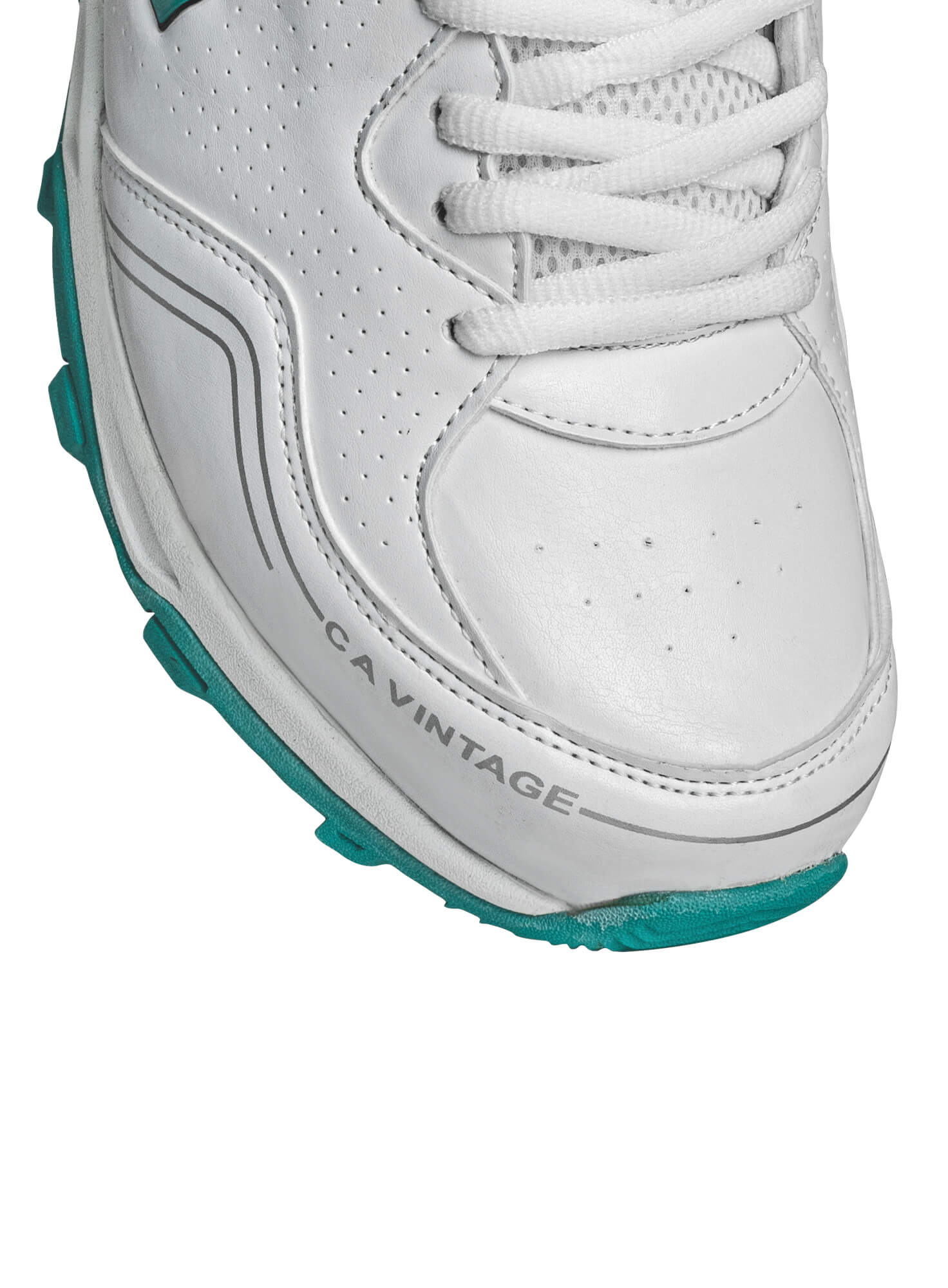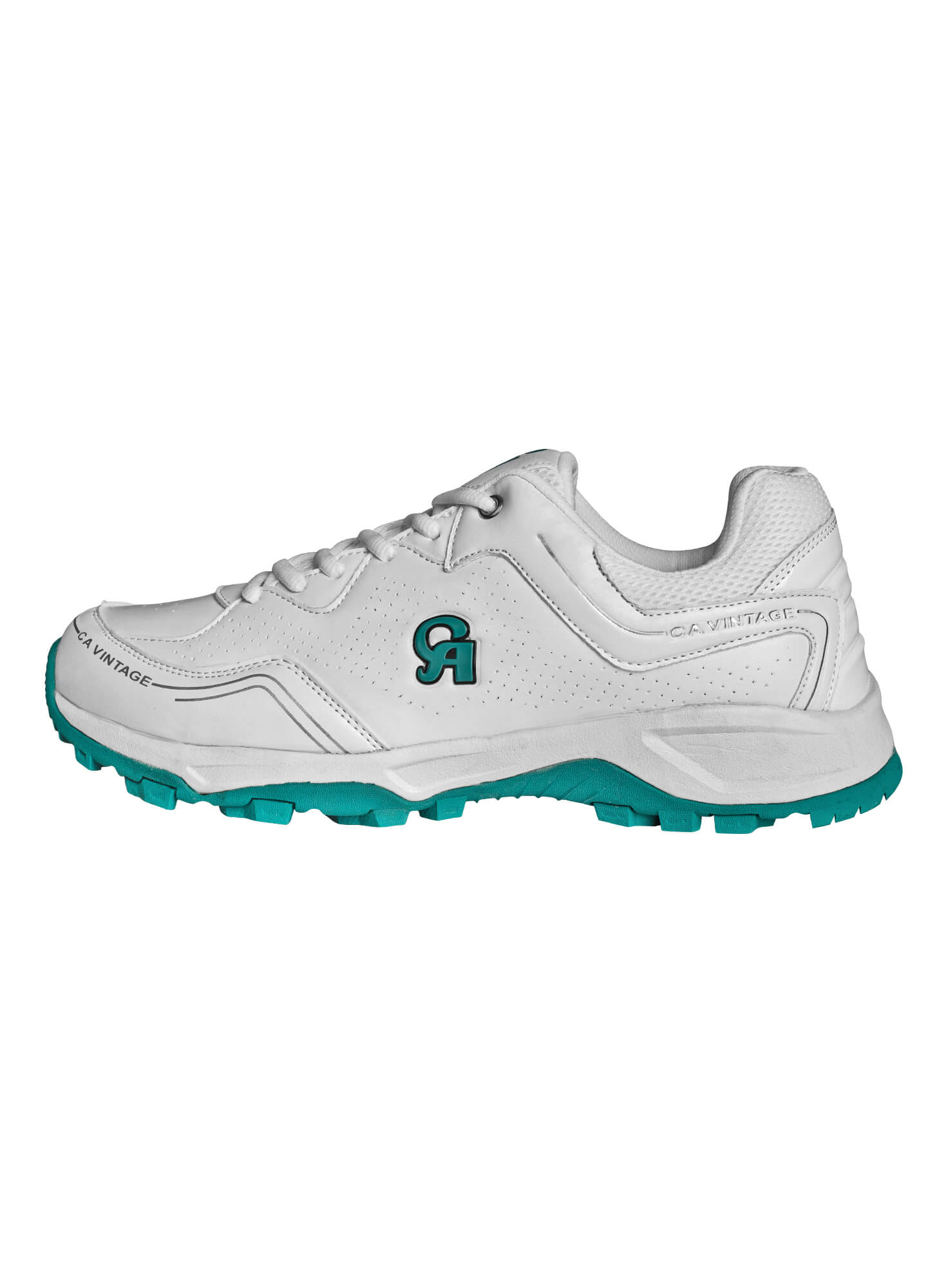 Experience the perfect blend of timeless style with the CA Sports Cricket Shoes (Pro Vintage). Designed for cricketers and athletes wearers alike, these white cricket shoes with a green sole feature a classic silhouette inspired by the iconic modern designs of the 70s and 80s. The upper is crafted from synthetic leather, offering durability and a luxurious feel, while the vent holes and air vents mesh inserts ensure optimal ventilation during intense activities, making them ideal for longer hours of play. The compact fit is perfect for running between the wickets and grounds. The cushioned insole and padded collar ensure superior comfort, reducing foot fatigue during long matches. The air vents mesh panels enhance ventilation, keeping your feet cool and dry even during intense play. Equipped with a high-traction rubber outsole, these shoes provide exceptional grip on both natural grass and artificial turf, ensuring stability and control during quick movements and sudden turns. The Pro Vintage shoes are designed with reinforced toe and heel areas, offering added protection and support where it's needed most. The lightweight construction allows for agility without compromising on sturdiness.