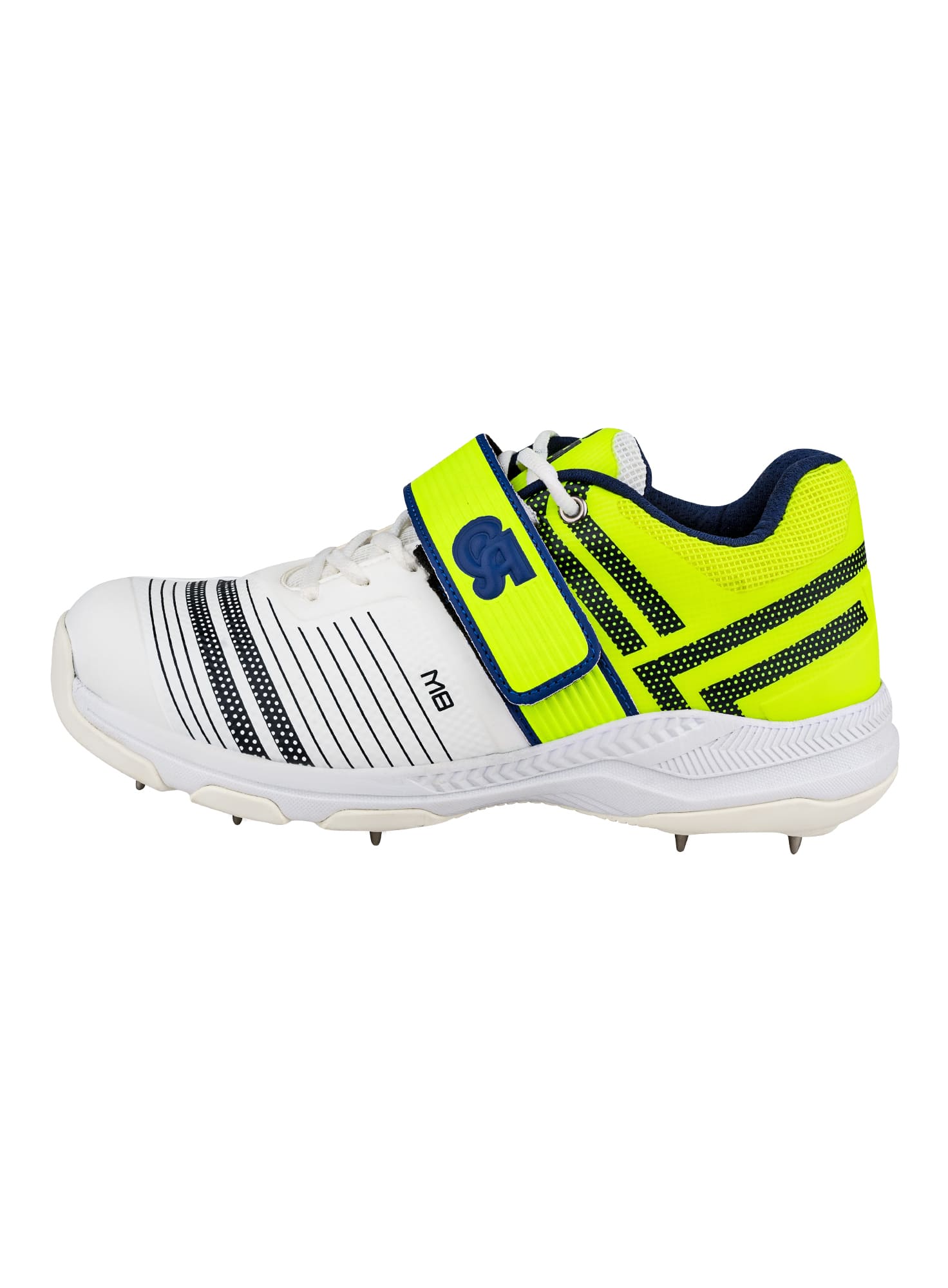 The CA Pro M-8 Spikes are high-performance cricket shoes built for players who need the best possible grip on the pitch. These shoes feature a modern design with a white front and a vibrant lime green back, accented by sharp navy blue lines. Designed for stability, the M-8 Spikes use both a traditional white lace-up system and a large lime green Velcro strap to keep your feet locked in place during fast movements. The upper part of the shoe is made with a mix of durable synthetic materials and breathable mesh to keep your feet comfortable throughout the match. On the bottom, the strong white outsole is equipped with 11 professional-grade metal spikes, ensuring you stay balanced while bowling, batting, or fielding on grass surfaces.